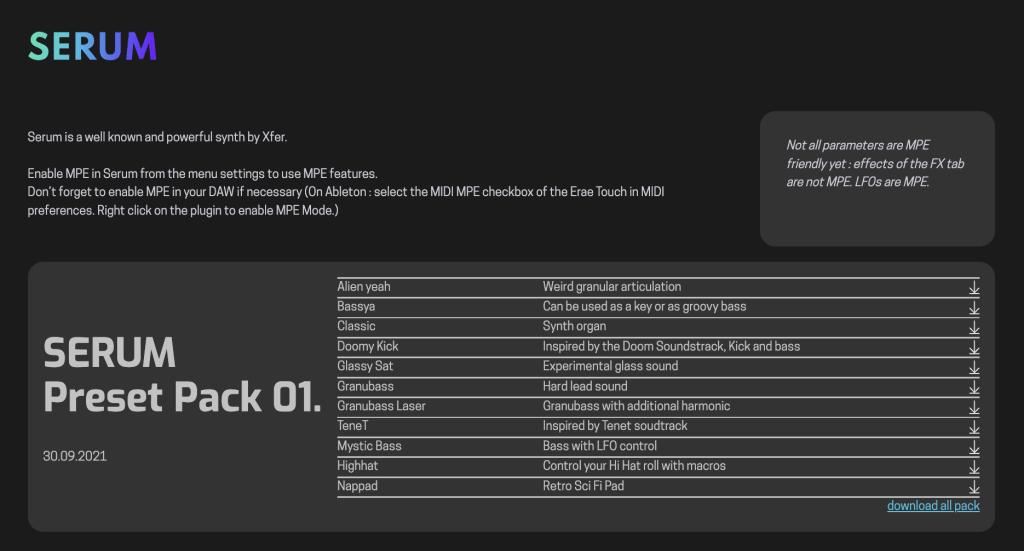 Services Sound design et création de presets Nouveaux services à venir ... Sound Design CRÉATIONS DE PRESETS DE SYNTHÉTISEUR ET DE LAYOUTS (VISUELS INTERACTIFS) POUR L’ERAE TOUCH DE EMBODME deux packs de presets multidimensionnel (MPE) Pour le synthétiseur Vital pack de presets multidimensionnel (MPE) Pour le synthétiseur Serum Création d'une interface musicale et de navigation du synthétiseur Pigments Ils m’ont fait confiance « Superbe travail de Woxaprod ! Il était très à l’écoute des demandes, a fait preuve de patience pour bien comprendre ma demande […] » Parlez-moi de votre projet